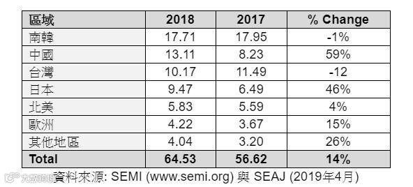 2017年,中国大陆占全球半导体设备销售量的15%,排在全球第3。而就在上周,SEMI的最新数据显示,2018年全球半导体制造设备销售总额达645亿美元,比2017年的566.2亿美元增长了14%,创下历史新高。中国大陆半导体设备市场更是首度以131.1美元超越台湾地区,居全球第二。