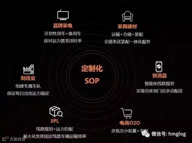 我们对客户提供的解决方案分为4个部分:一块叫运输、一块叫仓储、一块叫IT,一块叫金融: