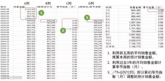 以年度销售金额的预测为例,我们先将历史销售数据按周和月整理,利用之前五周已经发生的实际销售金额的平均,推算本周的预计销售金额。使用五周或其他时间周期则必须参考企业的库存周转天数。接着以过去3年的月均销售金额计算季节指数(月),从季节指数可以看出所谓“大小月”,即哪些月份销售畅旺、哪些月份销售平平。最后把周预测销售金额乘上季节指数(月),可得到经季节指数调整的销售金额预估。以上是年度计划时的做法,每周结算实际销售金额时也需要更新数据,这样可确保预测的销售金额有更高的可参考性。