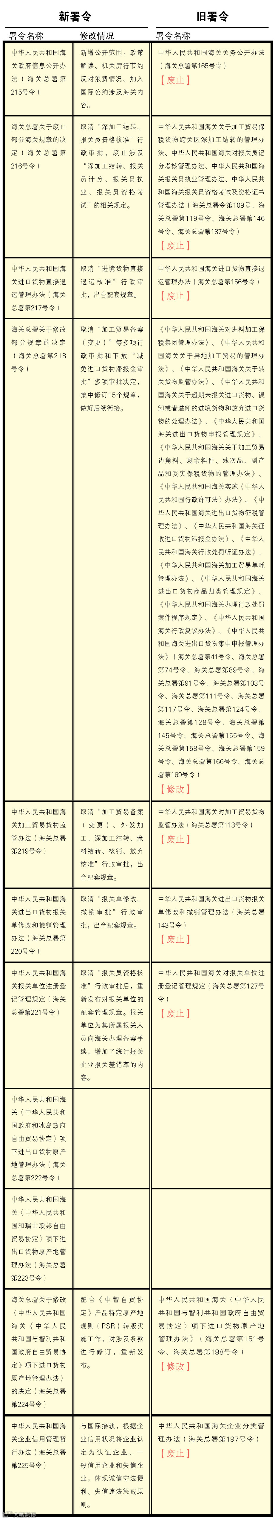 海关企业信用认证、报关单位注册管理、报关员资格核准、报关单的修改和撤销管理、加工贸易监管、进口货物退运、海关政府信息公开等一批对报关、通关、企业进出口监管非常实用的署令的新旧变更,小编特意制成一个对比图表,有利于对照差异,参照新制新规通关、报关,同时也便于保存和查看。