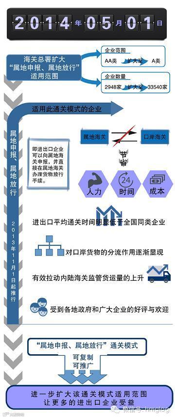 5月1日起海关总署扩大适用“属地申报、属地放行”通关模式的企业范围,由AA类企业扩大至A类企业,适用该通关模式的企业数量将由2948家扩大至33540家。