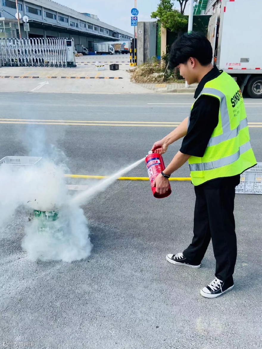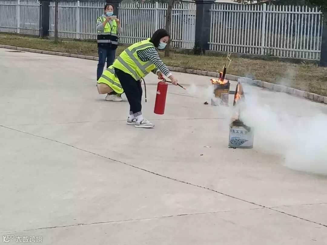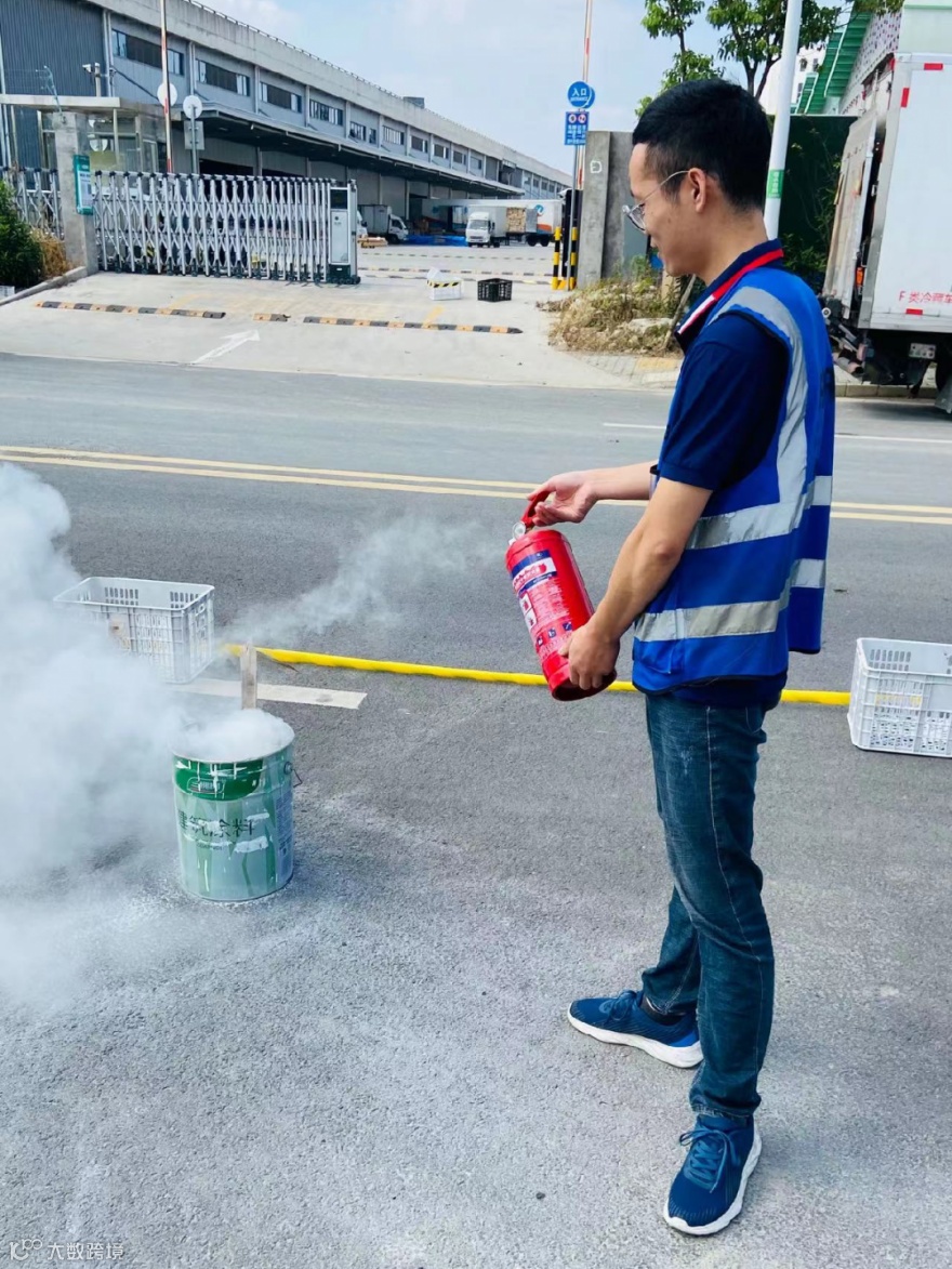各仓指派代表参加灭火器操作的演练,将铁桶中燃烧的大火扑灭。