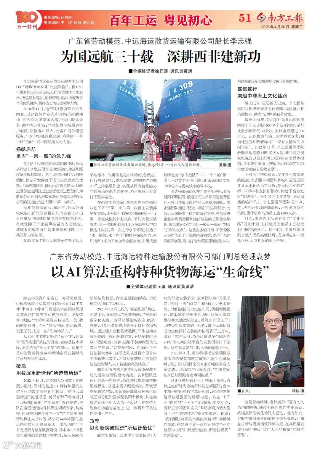 今年“五一”,袁梦荣获广东省劳动模范称号。南方工报以《以AI算法重构特种货物海运“生命线”》为题发表文章,对这位新时代劳模的事迹进行了报道,一起来看——
