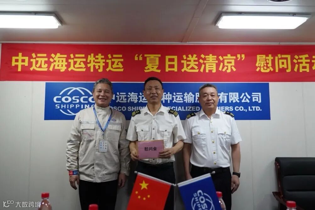 张炜董事长、党委书记带队到靠泊苏州太仓码头的“幸福松”轮及码头内特运PDI中心调研慰问,并开展“夏日送清凉”活动。