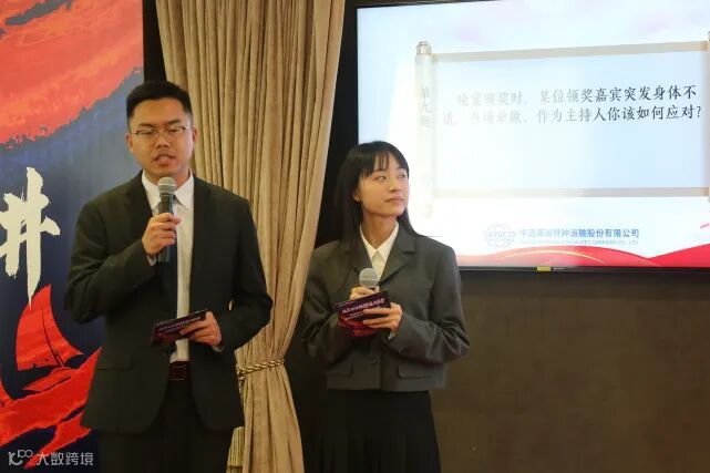 双人抽签搭档模拟“全球合作伙伴大会晚宴”主持,从开场致辞到颁奖环节,选手们以流畅的中英文表达、灵活的互动设计,生动展现国际化舞台掌控力。