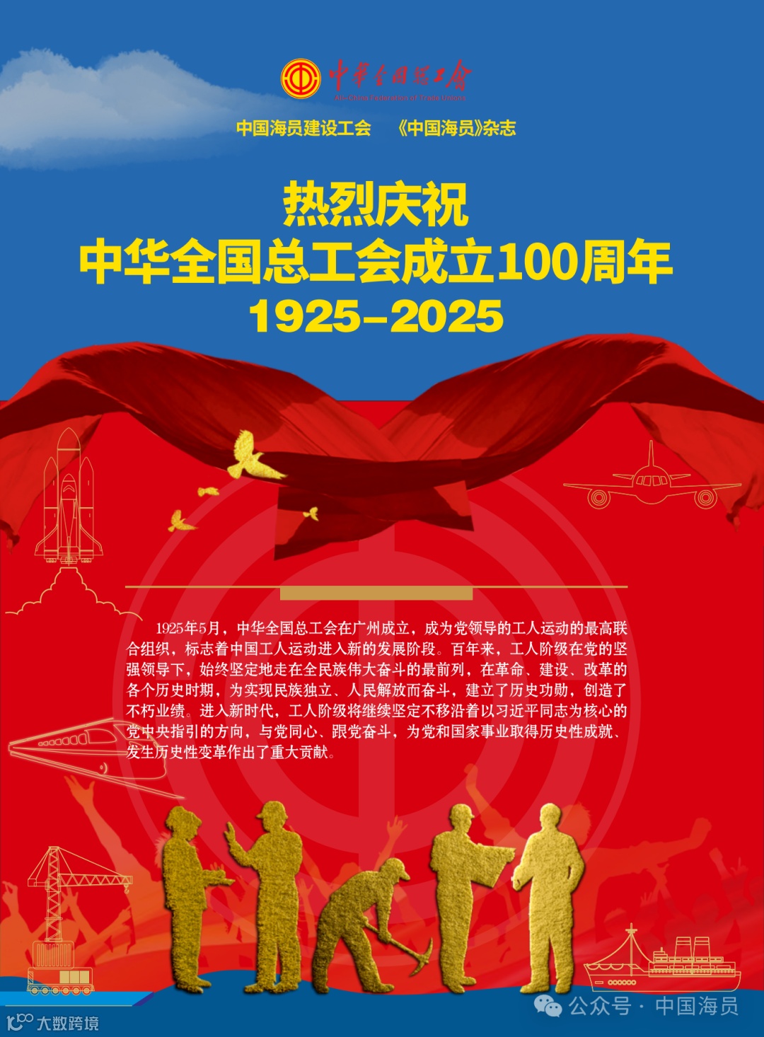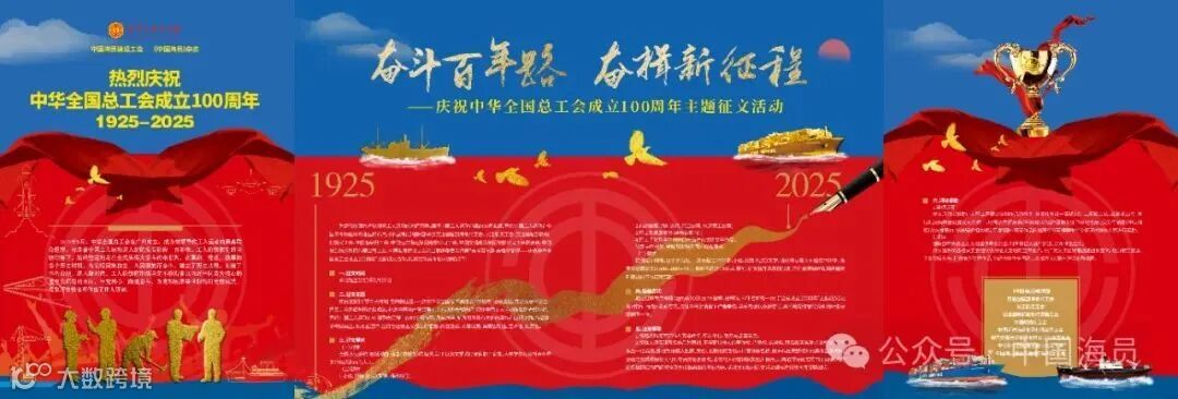 2025年5月1日,是中华全国总工会成立100周年纪念日。百年来,中国共产党领导的百年工人运动,凝聚起中国工人阶级的磅礴力量,彰显出亿万劳动群众的奋斗伟力,彰显了中国共产党人百年奋斗的伟大精神谱系。为纪念中国共产党领导工人运动的光辉历程,缅怀中国工人运动前辈的光辉业绩,宣传中国工人运动在中国革命历程中的地位和作用,《中国海员》编辑部联合交通运输部海事局工会、长江航务工会、交通运输部救助打捞局工会、中国船级社工会、中国远洋海运集团有限公司工会、中国交通建设集团有限公司工会联合会、中国长江航运集团有限公司工会、中国海员建设工会港口联络委员会开展“奋斗百年路 奋楫新征程——庆祝中华全国总工会成立100周年”主题征文活动。现将活动具体要求通知如下: