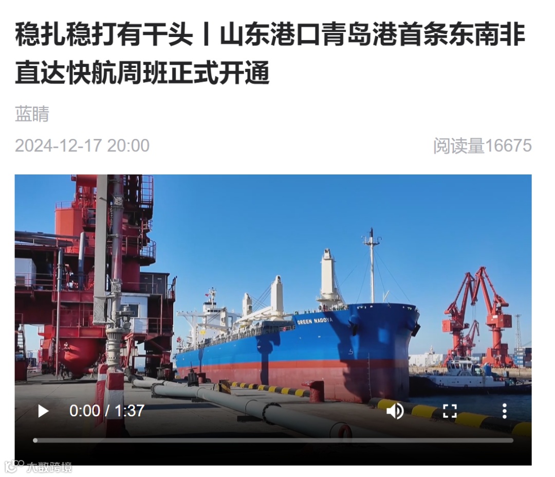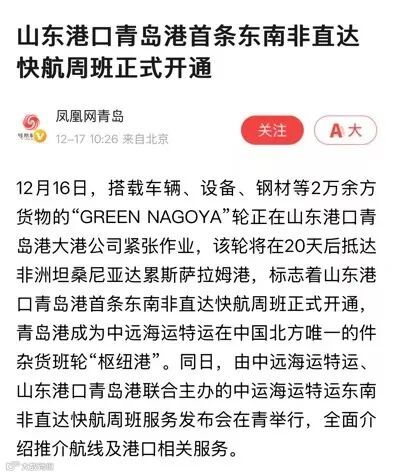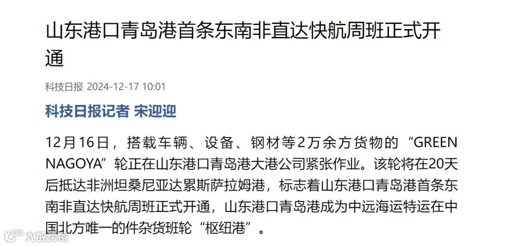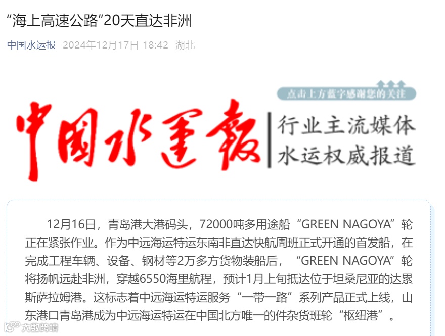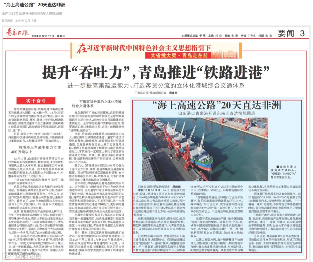 ►青岛日报称:东南非直达快航的开通,是中国制造“出海”再加速的缩影。