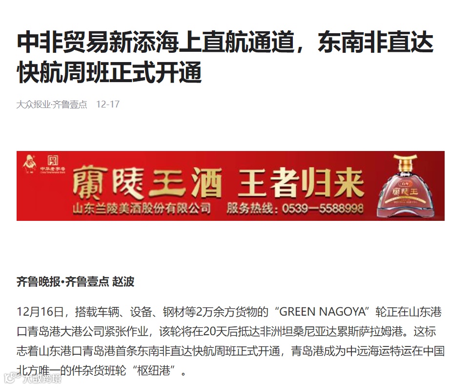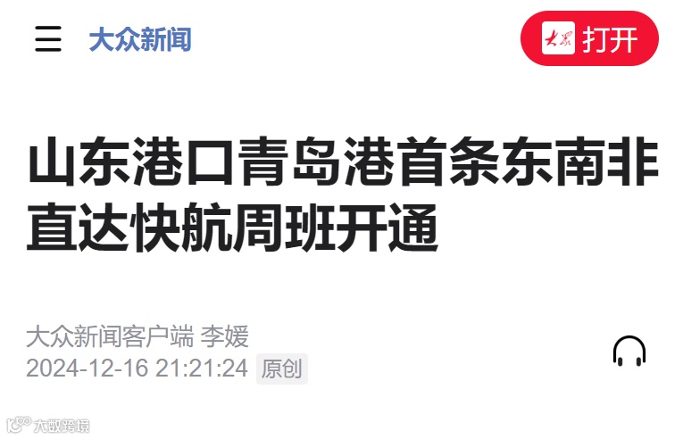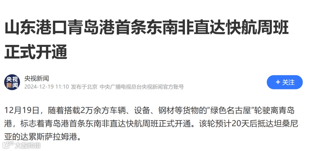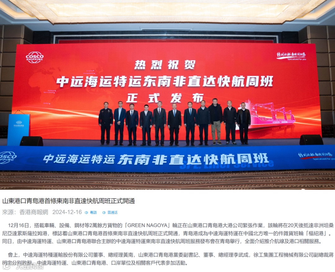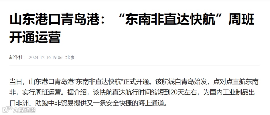 ►青岛日报称:东南非直达快航的开通,是中国制造“出海”再加速的缩影。