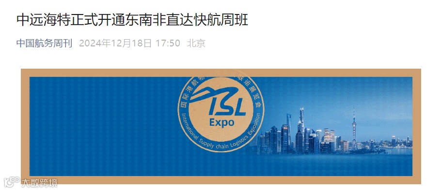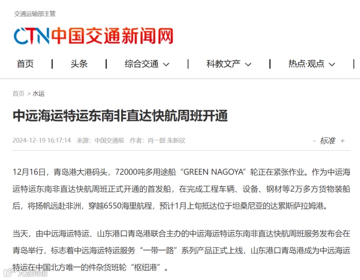 ► 中国交通新闻网称:中远海运特运东南非直达快航周班产品具有6大显著优势:周班服务,稳定可靠;直达快航,一港装卸;技术保障,安全可靠;数智赋能,物网互联;绿色船队,环境友好;全程物流,定制服务。