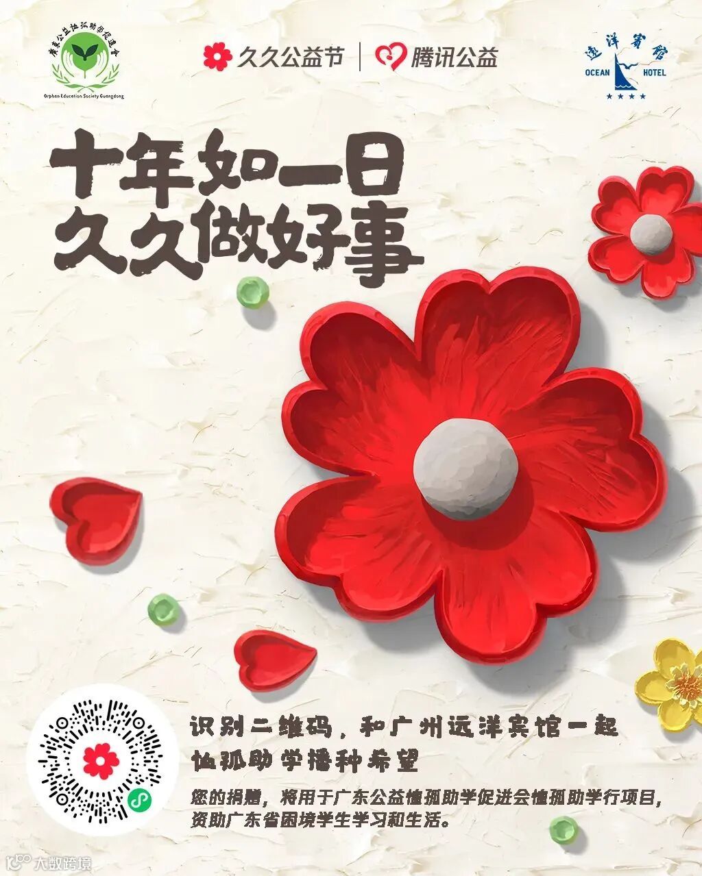十年如一日,久久做好事,腾讯公益将在9月5日-9日启动第十年的久久公益节活动。为助力广东公益恤孤助学促进会开展的慈善项目,推动“恤孤助学行”项目的募捐工作,广州远洋宾馆诚邀您一块献爱心、做好事,一起为公益慈善事业助力,帮助乡村困境儿童完成学业梦。
