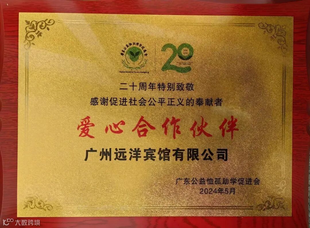 一直以来,广州远洋宾馆坚持深耕公益慈善事业,积极支持帮助该会“好事办好”,定期组织职工开展社区志愿服务、无偿献血、扶贫济困爱心捐款等活动,积极助力乡村振兴、服务居民就地过年、为贫困农家病童提供免费住宿等,用一项项善行义举传递爱心力量,赢得群众“点赞”和社会“鼓掌”。2024年5月18日,宾馆获颁广东公益恤孤助学促进会“爱心合作伙伴”奖。
