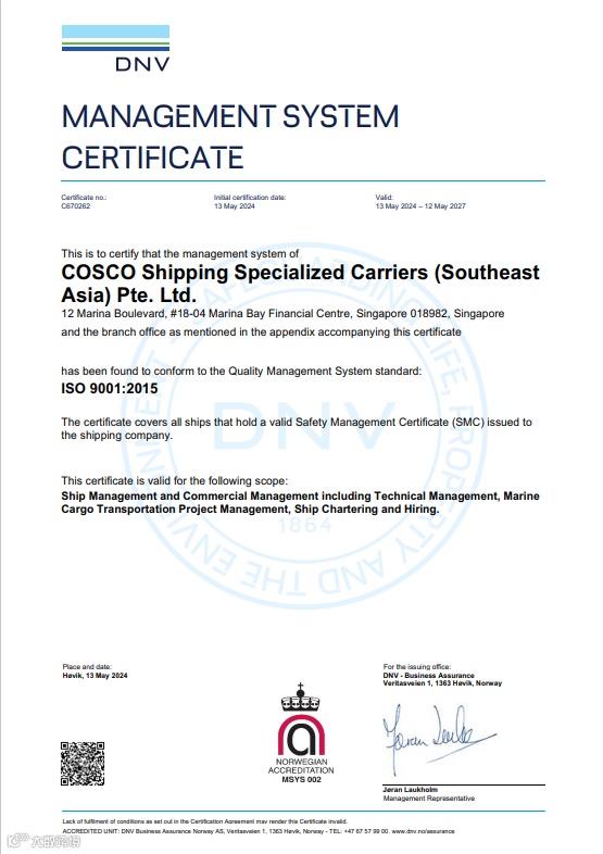 ISO三标证书是企业进入国际市场的“通行证”,能够有效证明企业在质量管理、环境管理和职业健康安全管理体系建设方面所做出的努力和达到的水平。目前,特运东南亚公司已取得DNV船级社新加坡旗、利比里亚旗、巴拿马旗和香港旗符合证明,成为特运首个DOC和三标证书均顺利通过DNV船级社审核的子公司。