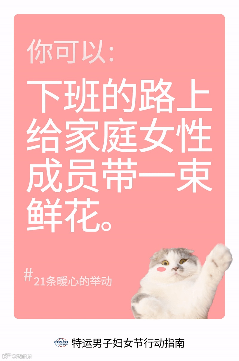 在此抛砖引玉,我们特地为男同胞们整理了21个妇女节的暖心小举动,放在下方的动图里,欢迎截图保存,并付诸实践。