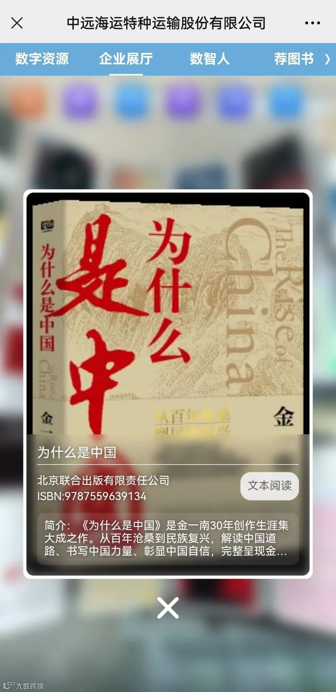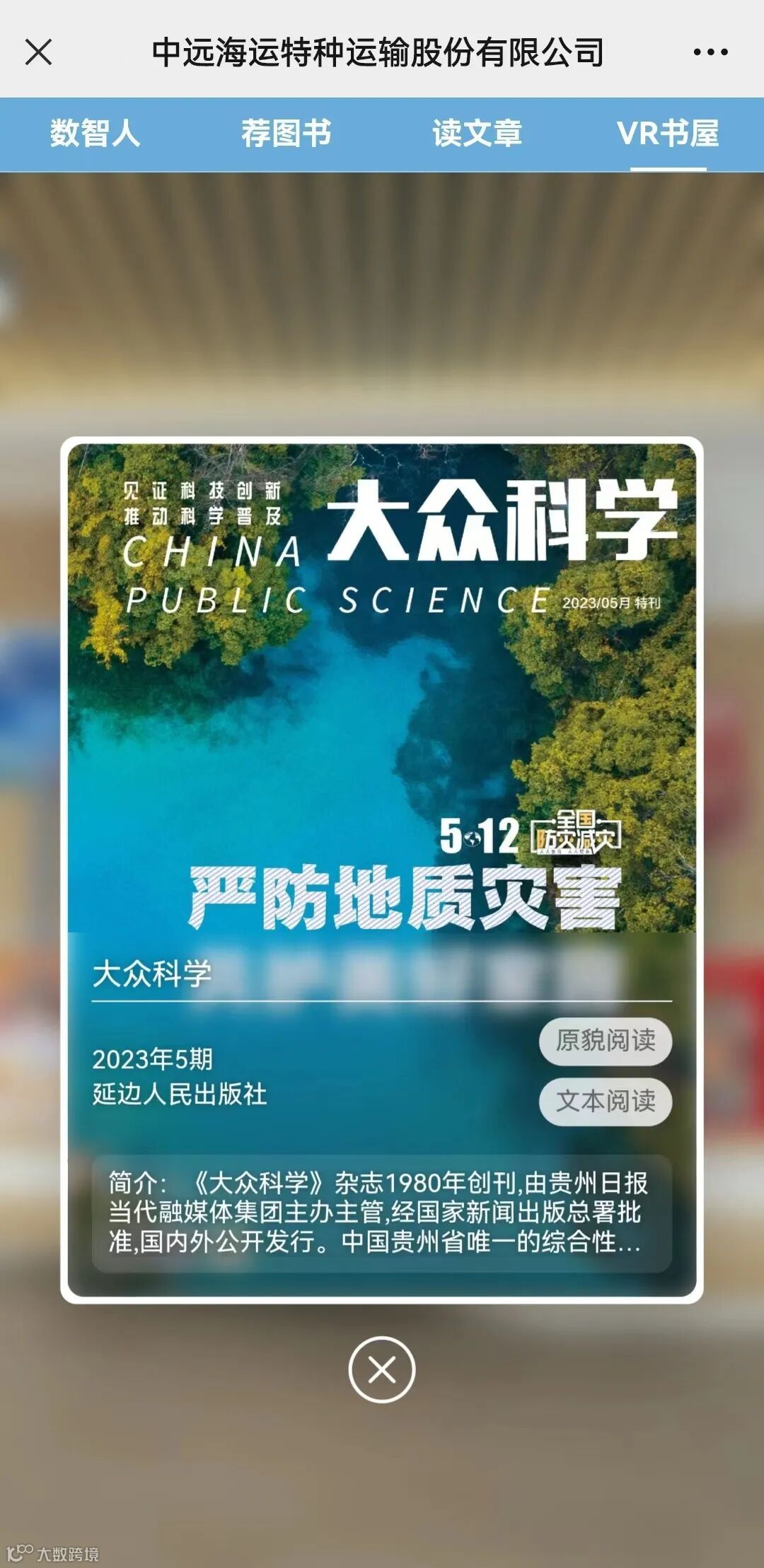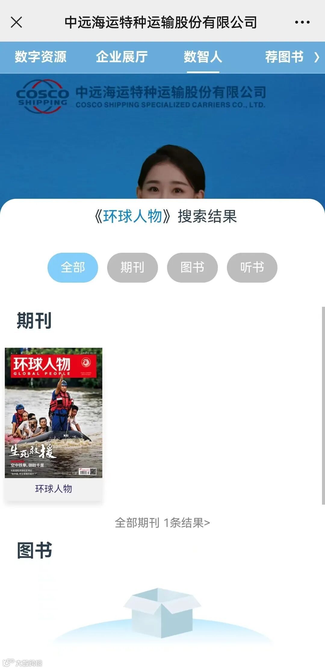职工电子书屋海量资源均可免费阅读,3000余种期刊、6万多册电子图书、10万余小时听书,实时更新。关注“中远海运特运”微信公众号,点击底部菜单“公司简介”-“职工电子书屋”。