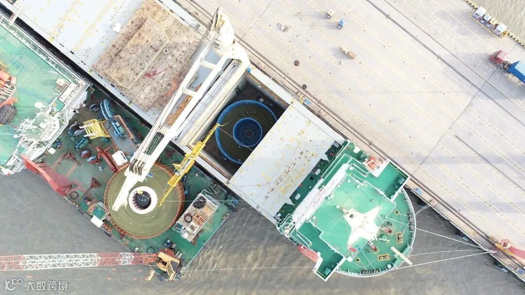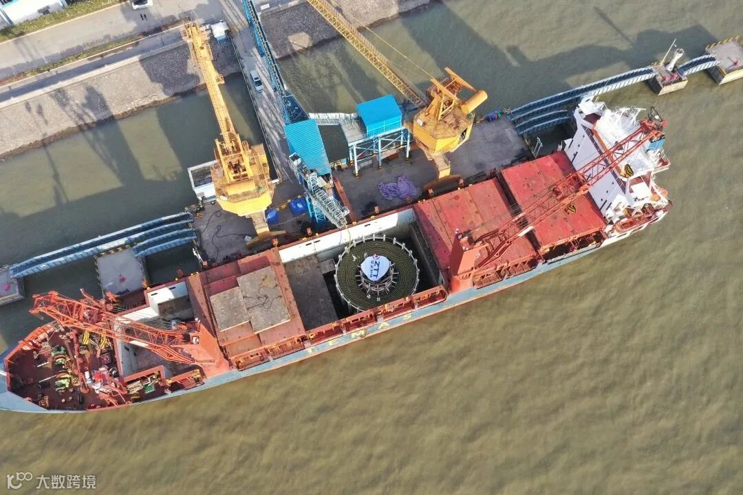 4月26日,江苏太仓码头。在经过一系列定制化的操作后,特运“大三”系列重吊船“大泰”轮承载重达2400吨、约43公里长的海底电缆整装待发,将启航前往欧洲。
