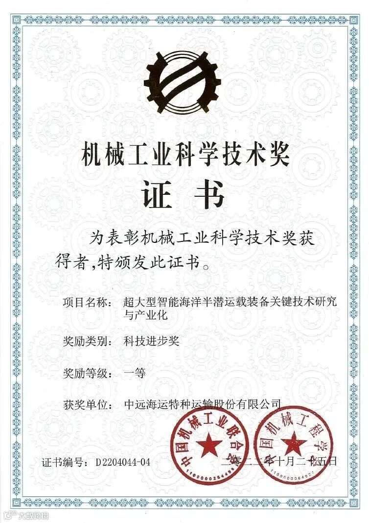 中远海运特种运输股份有限公司参与的“超大型智能海洋半潜运载装备关键技术研究与产业化”项目,获得由中国机械工业联合会、中国机械工程学会联合颁发的机械工业科学技术奖科技进步一等奖。