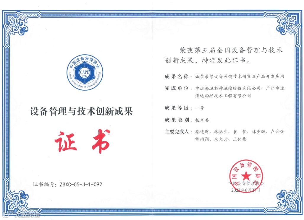 ▲ 第五届全国设备管理与技术创新成果一等奖团队证书