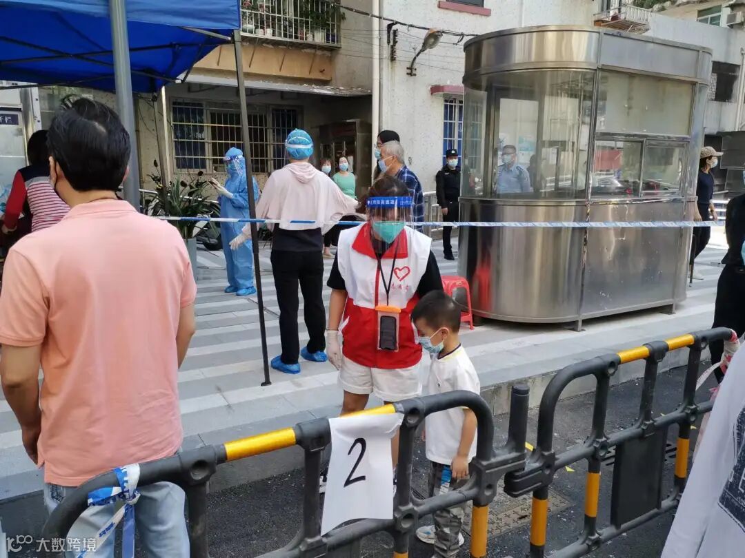 “请打开粤核酸3小程序,选择大规模核酸筛查,登记信息并截图”,“请戴好口罩,保持间距”,“请有序排队,切勿拥挤”……远海建设志愿者穿梭在核酸检测队伍中。