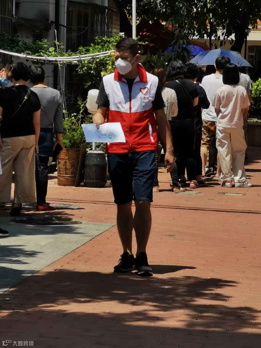 在30摄氏度的高温下,志愿者们汗流浃背,但士气依然高涨。“天气炎热,注意防晒”,他们用嘶哑的声音不停在提醒排队的人们,浑不在意自己的衣服早已湿透。