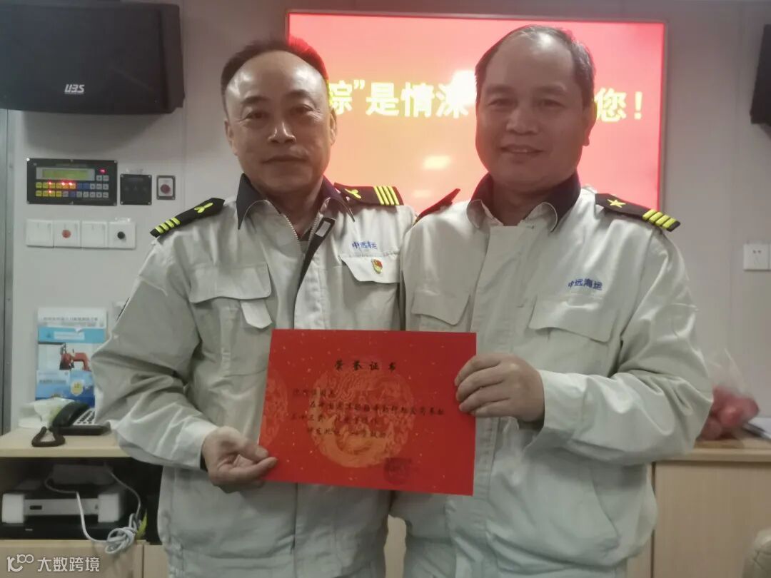 陈碧光船长、黄家明政委分别代表船舶和船舶党支部,对倪国强轮机长33年来任劳任怨地工作,对远洋事业的坚守和奉献给予充分肯定和表示衷心感谢,并为他颁发了荣誉证书和慰问金。