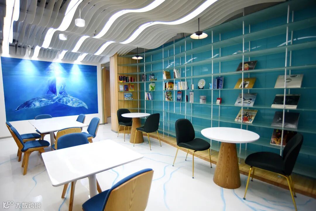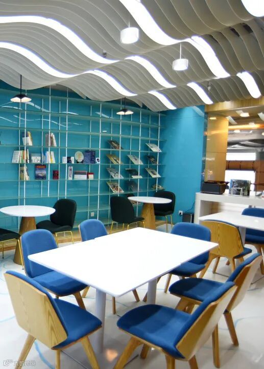 将波浪形的天花板、弧形的木质纹理墙壁和鱼尾形状的装饰壁画等引入室内空间