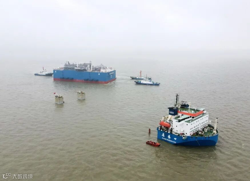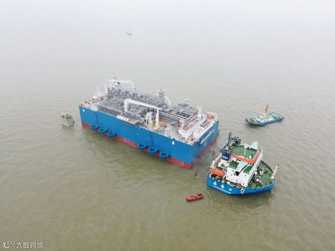 “康盛口”轮全员就位,装货作业正式开始。江面风平浪静,远处大型LNG海上浮式再气化单元“TORMAN”在4艘拖轮的拖带下缓缓驶来。9时50分,“康盛口”轮下潜到装货吃水,一切正常。