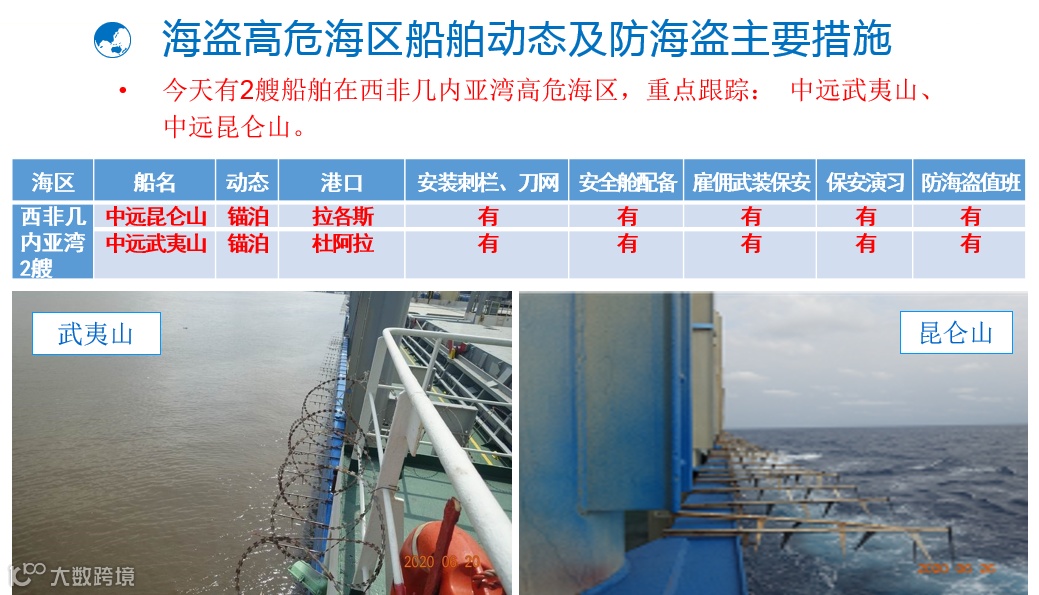 防海盗单元跟踪指导防海盗高危海区船舶25艘次,雇佣武装保安护航4艘次;24小时跟踪指导开往重点区域拉各斯港的“中远昆仑山”轮,确保船舶安全。