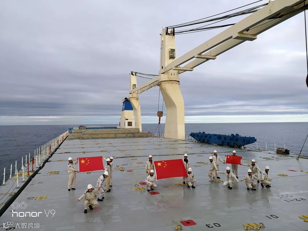 公司第二艘东行船大祥轮在77度48分的航路最北点举行庄严的升国旗仪式并合影留念。 |