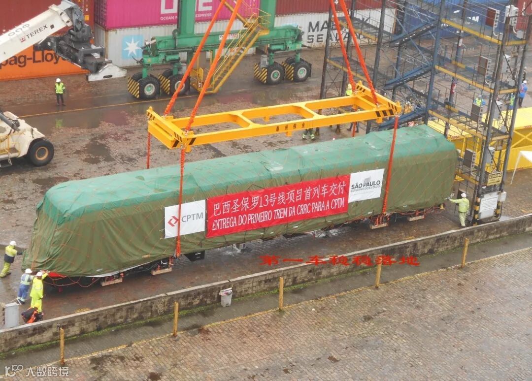 ▲ 9月5日在巴西桑托斯港顺利卸下中国出口巴西的首批8节城轨列车车厢,圆满完成运输任务。