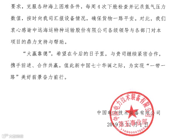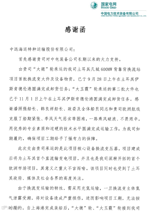 近日,特运公司收到中国电力技术装备有限公司热情洋溢的感谢函,对特运公司圆满完成其土耳其凡城600兆瓦背靠背换流站项目换流变大件及设备物资运输工作表示感谢。