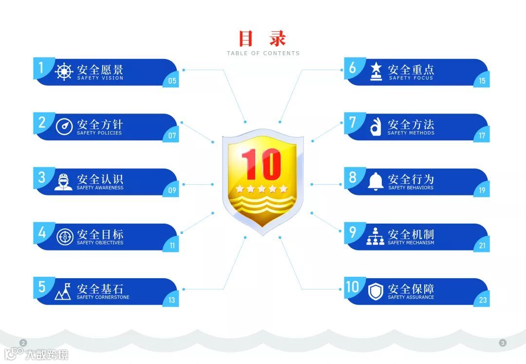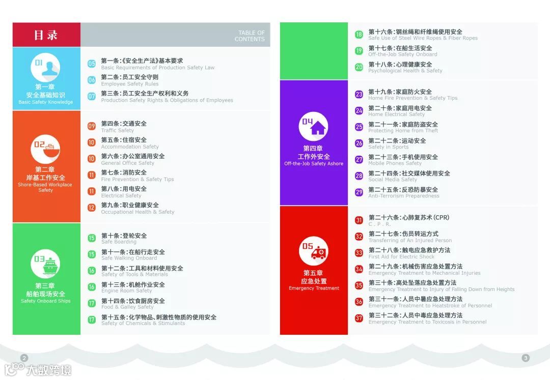 内容包括安全基础知识、岸基工作安全、船舶现场安全、工作外安全、应急处置救援等船岸员工日常工作和生活中所需的各类安全防护常识和技能,旨在帮助员工及早识别安全风险、养成良好安全习惯,为员工提供“安全工作和生活指南”。