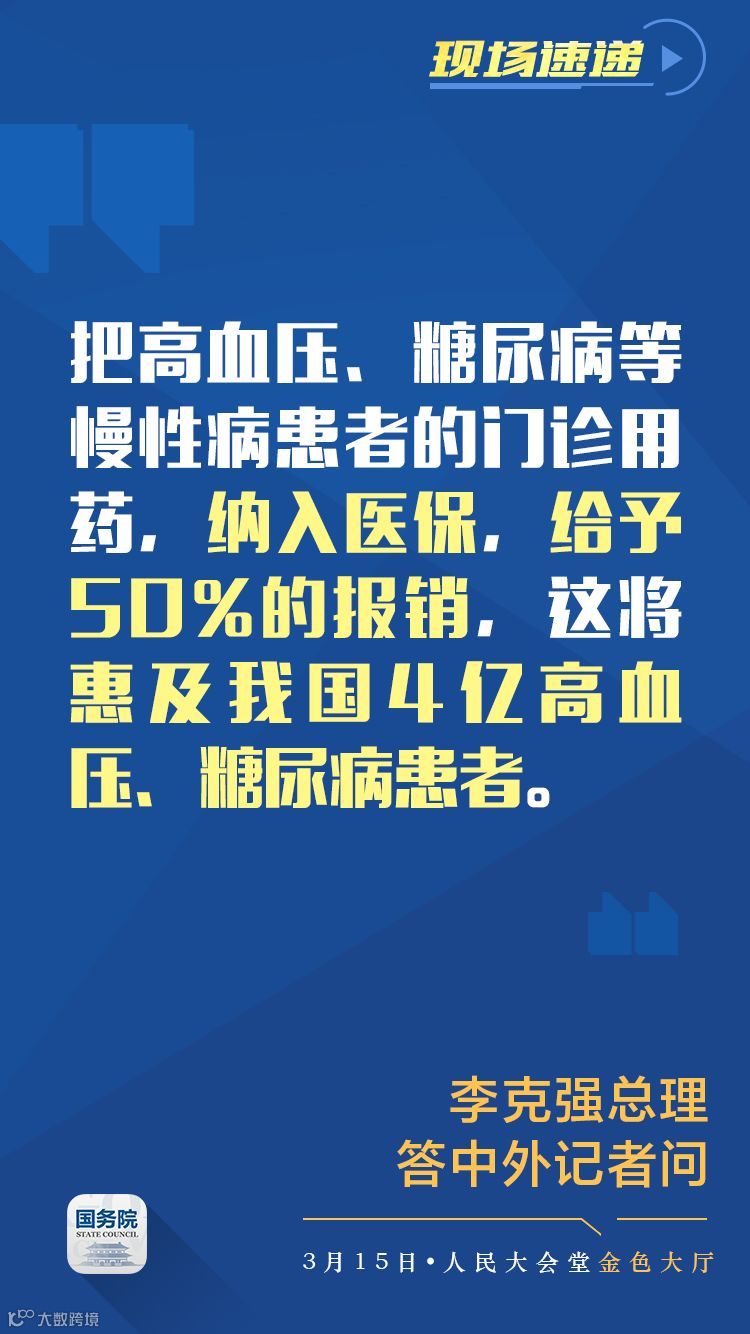 李克强:今年还要做两件事。一是把高血压、糖尿病等慢性病患者的门诊用药,纳入医保,给予50%的报销;二是要提升大病保险的报销标准。没有健康就没有幸福。