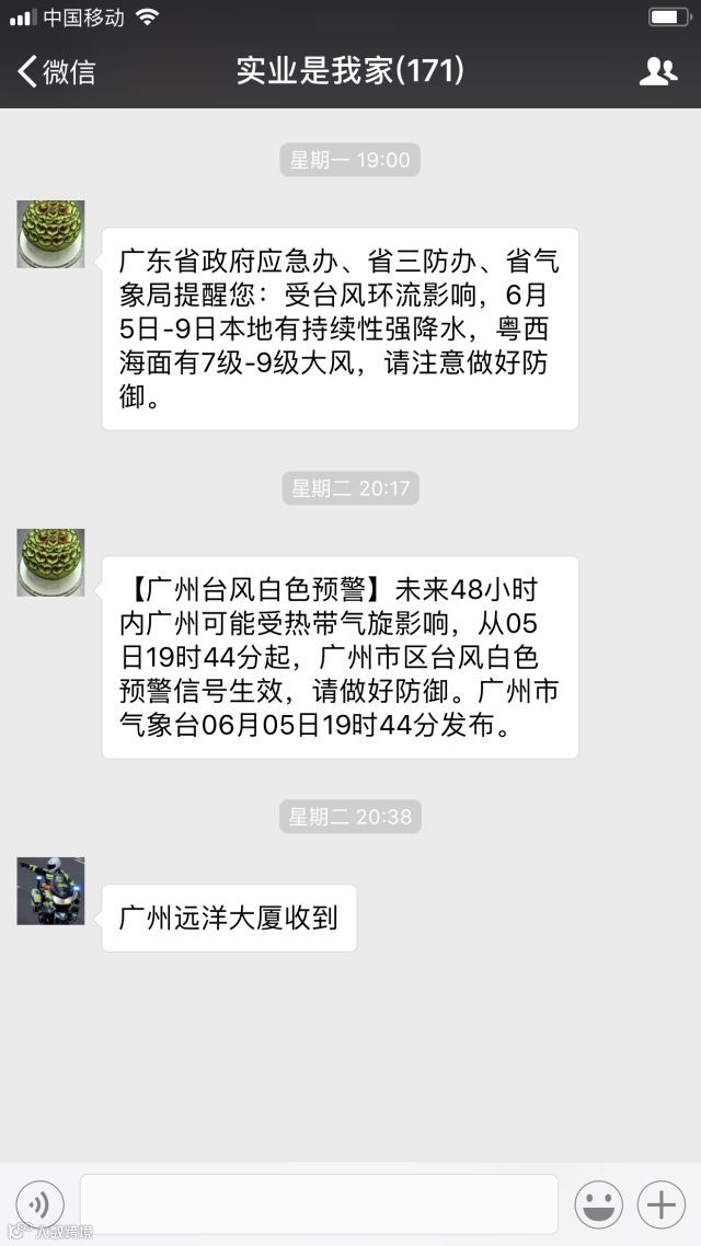 物业管理部6月6日就向各服务中心转发了中远海运特运和远海建设有关防范今年第4号台风的通知和要求,各服务中心也于同一时间启动预案做好防台工作部署。