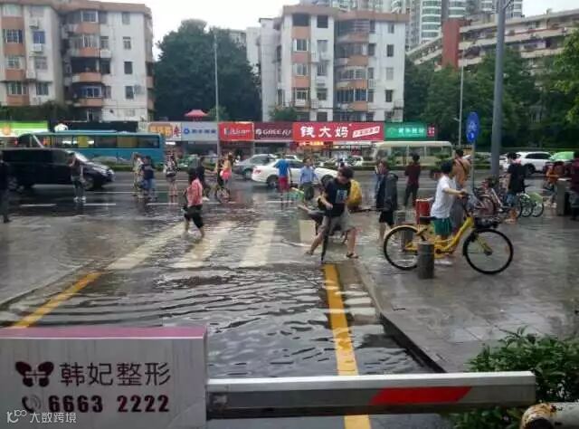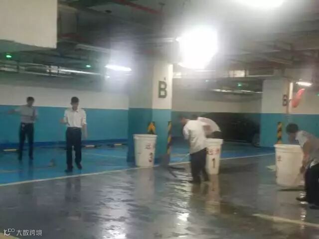 天河物业服务中心管辖的天河东小区出口当天马路积水严重,一度出现大水倒灌10栋地下车库,工作人员及时通知车主将地下车库车辆全部移出,随后将车库积水全部排干。