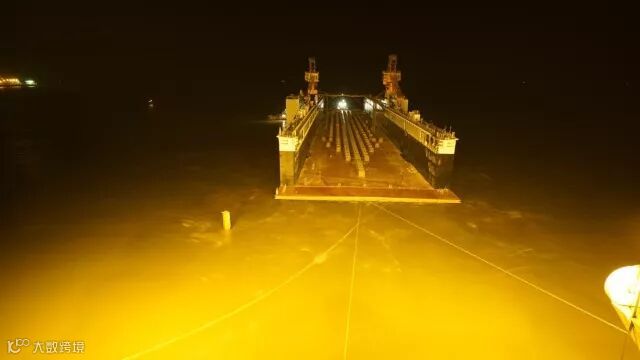 夜幕降临,浮船坞拖进新光华轮约50米,这时海上风速逐渐增大,浮船坞外侧突出的卡环也渐渐进入艉浮箱区域。考虑到天气变化,黄船长调整了带缆点,并与拖轮船长进行沟通,及时改变了缆绳控制和行进速度,卡环终于顺利通过艉浮箱。但这时丝毫不能松懈,因为后面还有几个突出的“缆桩”等待排队通过艉浮箱。