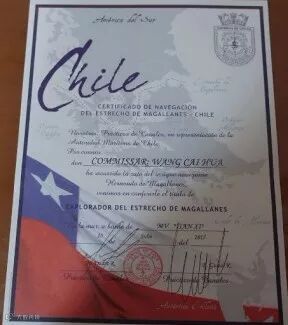 证书为一张厚实的A4纸,用西班牙文写着“航经智利麦哲伦海峡证书”,上面有船员职务、姓名、颁发日期及两位引水的签名,还加盖有引水公司的印章,背景为海峡的航行海图和智利国旗,背面用英文和西班牙文简略地写了一下海峡发现的时间及其重要性,整体看上去朴素美观大方。