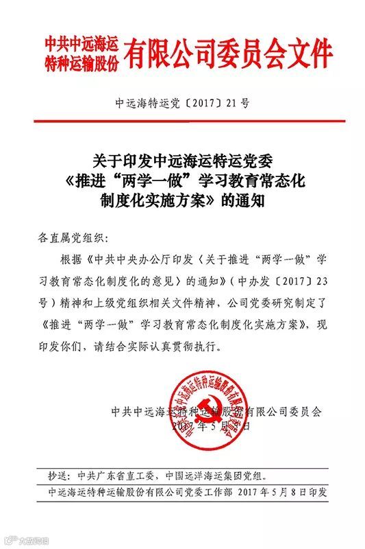 2017年5月5日,公司党委结合公司实际,制定下发《中远海运特运推进“两学一做”学习教育常态化制度化实施方案》,明确推进学习教育常态化制度化的基本目标和要求、具体任务和措施,对推进学习教育常态化制度化进行了全面部署。