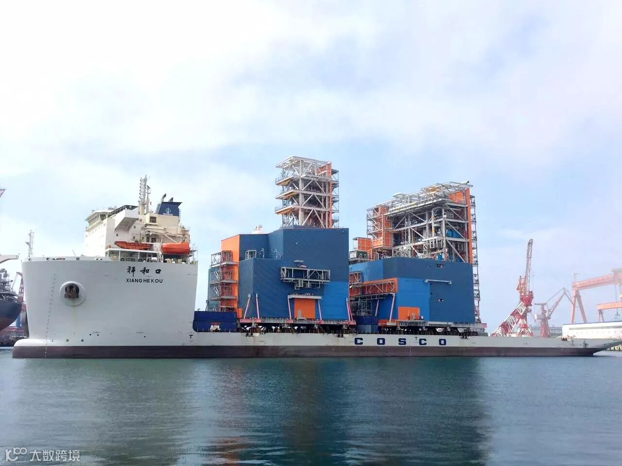2016年8月29日中午,5万吨级半潜船祥云口轮,装载着3个天然气处理模块,从青岛港中海油码头出发,自东往西通过北极东北航道,前往北极圈内的俄罗斯萨贝塔港。
