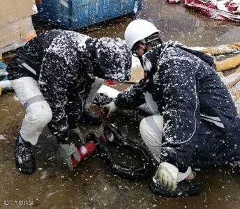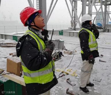 由于风雪越来越大,能见度越来越低,大家望“雪”兴叹,作业数次被迫中止,待风雪变小、满足安全作业要求,又争分夺秒、见缝插针再继续进行。