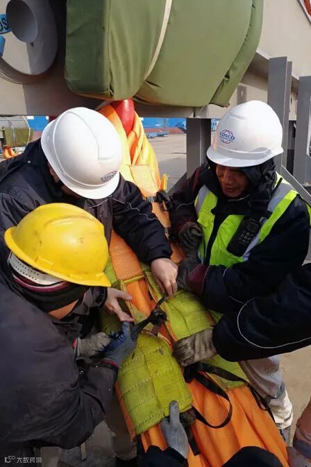 镜头三:船员们在吊具吊带上绑防碰垫,细心呵护货物。