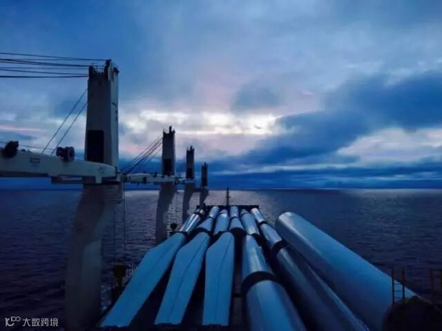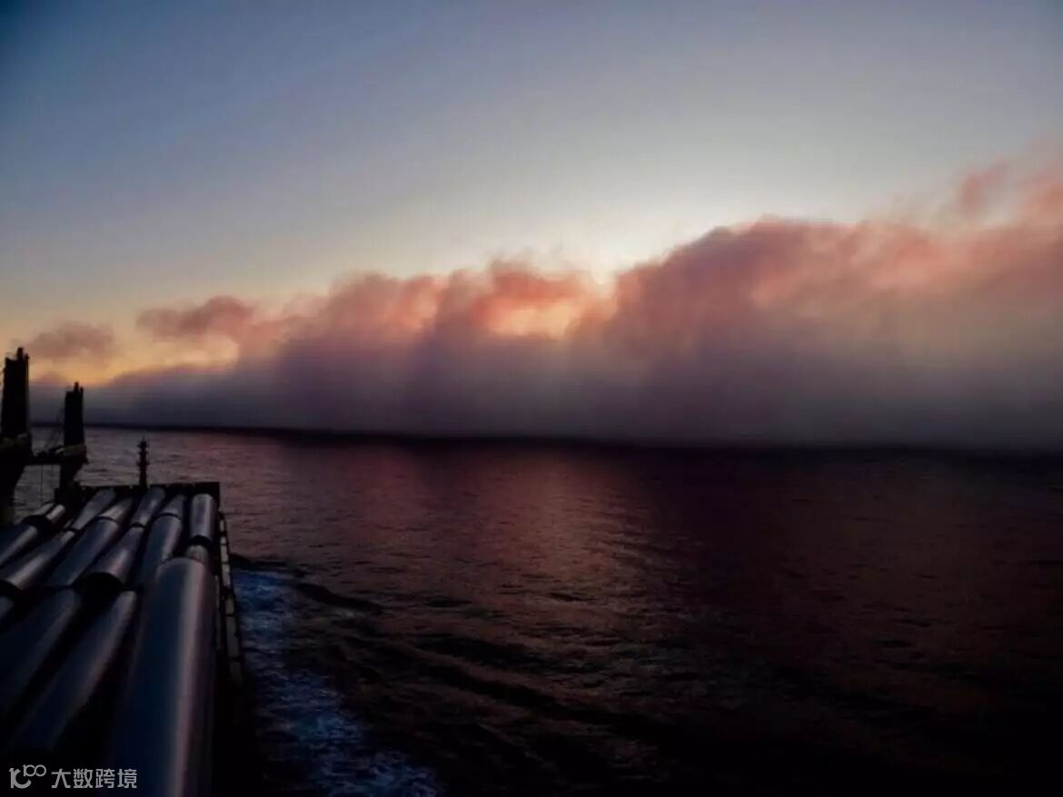 晚上7点左右,船艏方向太阳由火红变成金黄。日落即将开始,海面上波光粼粼,舱盖甲板上的风电设备也被铺上了一层金辉。随船的刘记者正准备记录日落最美的一刻,就在此时,突然在船头方向凭空生出一道巨大的烟幕,像城墙一样从我们的正前方铺天盖地而来。那巨大的烟幕先是被太阳映照得像一幅油画一样在船头方向变幻不定,颜色由粉红向淡灰渐变,紧接着以迅雷不及掩耳之势盖过船身,一瞬间,整个大船便被大雾包围,天苍苍、野茫茫,天水混沌,水天一色,无边无际。雾流冲洗着人们的面容,浪花忽明忽暗。船舶在白雾中航行,仿佛八仙过海般有一种腾云驾雾的飘逸感——那真是一种无比奇妙的体验。