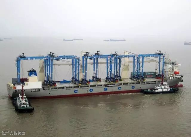 2014年8月,大德轮首航满载7台RTG起重门机,刷新了世界同类型船舶一次装载RTG整机数量最多的纪录。在此次运输中,中远海运特运首创了3台RTG门机在舱盖上成“品”字形交错同时行走的方法,并创新“过桥”技术,实现了重吊船“吊滚”作业的新尝试。这种模式省去了设计桥板以及在桥板上行驶的困难,但由于RTG尺寸较大且高度很高,整个过程需要非常平稳地进行,这对相关操作人员提出了很高的要求。在中远海运特运港口船长和货方技术人员的默契配合下,依靠船员精湛的操吊技术,最终顺利安全地将RTG吊滚到指定位置,圆满完成装货任务。