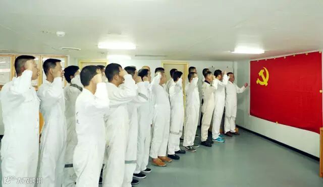生活区内,一帮热血男儿正面向党旗,庄严宣誓。