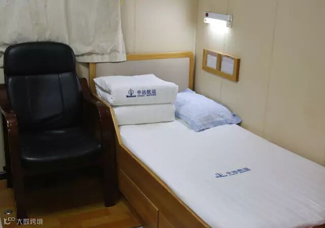 随船人员集中住在C甲板,这一层的房间都配有双层单人床、书桌、椅子、衣柜、沙发、垃圾桶、卫生间等,因为临时居住,杂物较少,房间都很整洁。D甲板住了大部分船员。先去大副房间。客厅不大,但家具齐全、颜色统一,感觉很温馨;卧室里,被子叠得四四方方,“中远航运”的字样恰好在床单和被子中间。