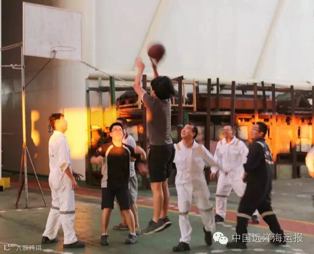 时间下午两点,夕阳为甲板上的篮球赛送来一道道暖光。天天辛苦劳作的船员们个个生龙活虎,都已是“大叔”、“大哥”级的政委、老轨、大副、水头等人也当仁不让,与一群80后、90后你争我抢,好不热闹。