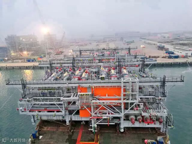 )有限公司为亚马尔项目建造的两个大型液化天然气模块缓缓驶离码头。而在同一天,中远航运祥和口轮也装载着青岛武船麦克德莫特海洋工程有限公司承建的3个大型模块,从青岛