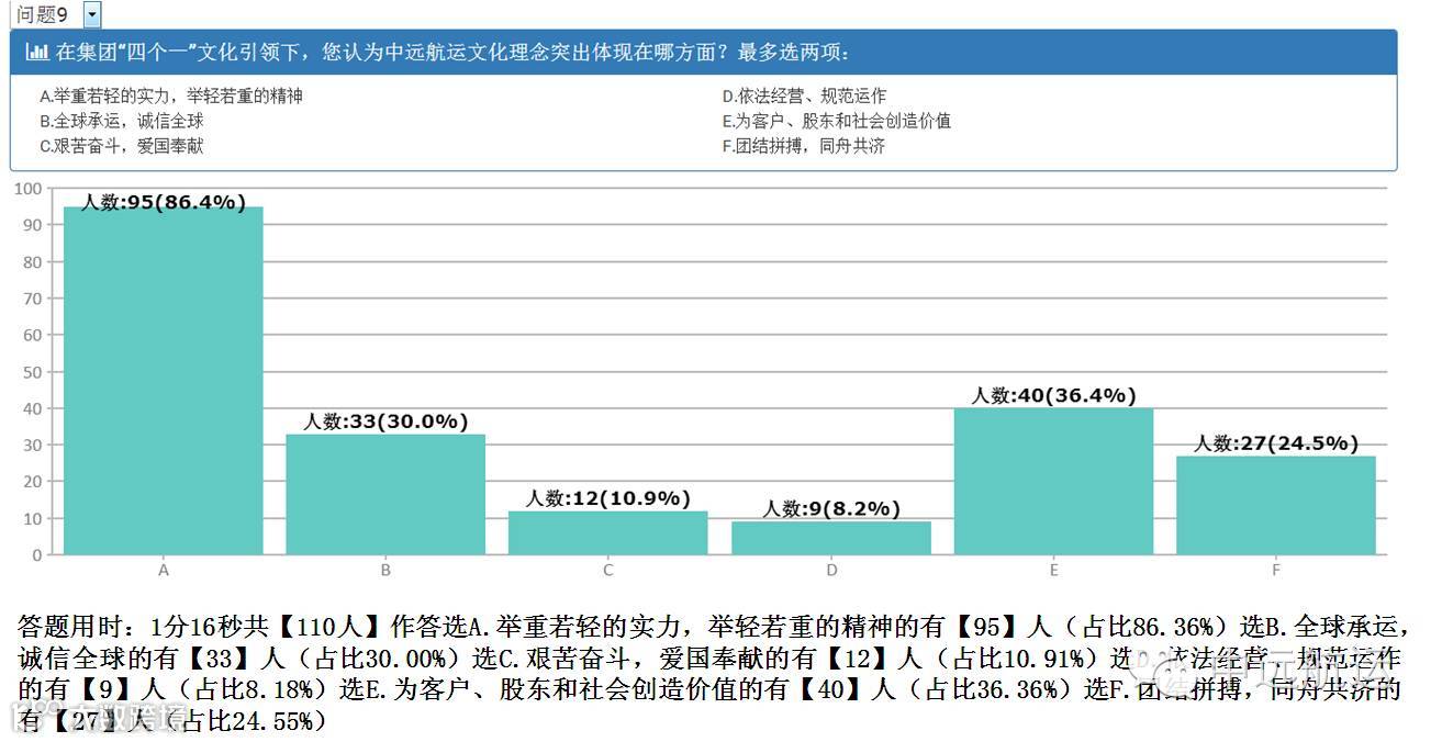 首先来看看热身题,小编感觉被设计团队萌得不要不要的~选项D以超过半数的绝对优势大获全胜。做过公司足球队现场拉拉队员的小编表示,这种雀跃不是平白无故的,咱中远航运人对自己的足球队是很有情结的!
