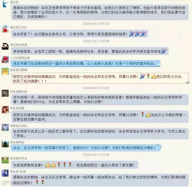 6月16日下午,涂慕欧总经理代表宾馆党委在“万事领航”QQ群,对本次参与接待全体员工的辛勤付出,表示热烈的祝贺和诚挚的慰问!