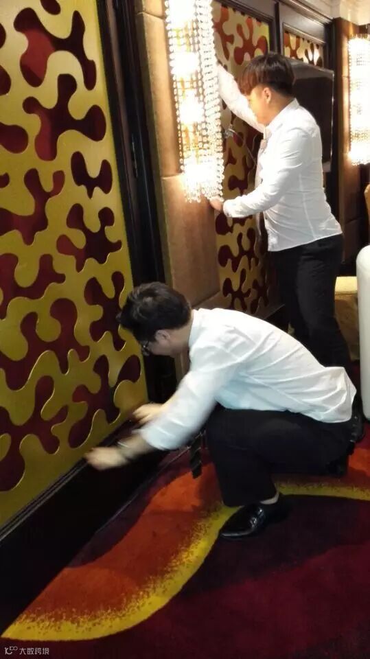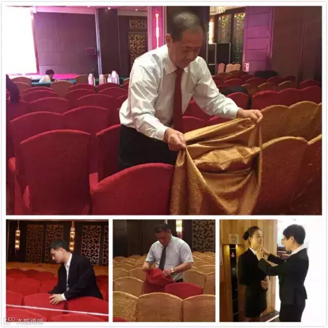会场人手不足,宾馆领导率先垂范,深入现场一线,分别为椅子安装椅套,检查指导服务接待人员妆容。