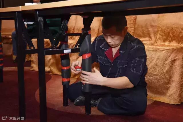 为确保与会嘉宾行动安全,工程技术人员给会议桌的桌腿包装防撞条。